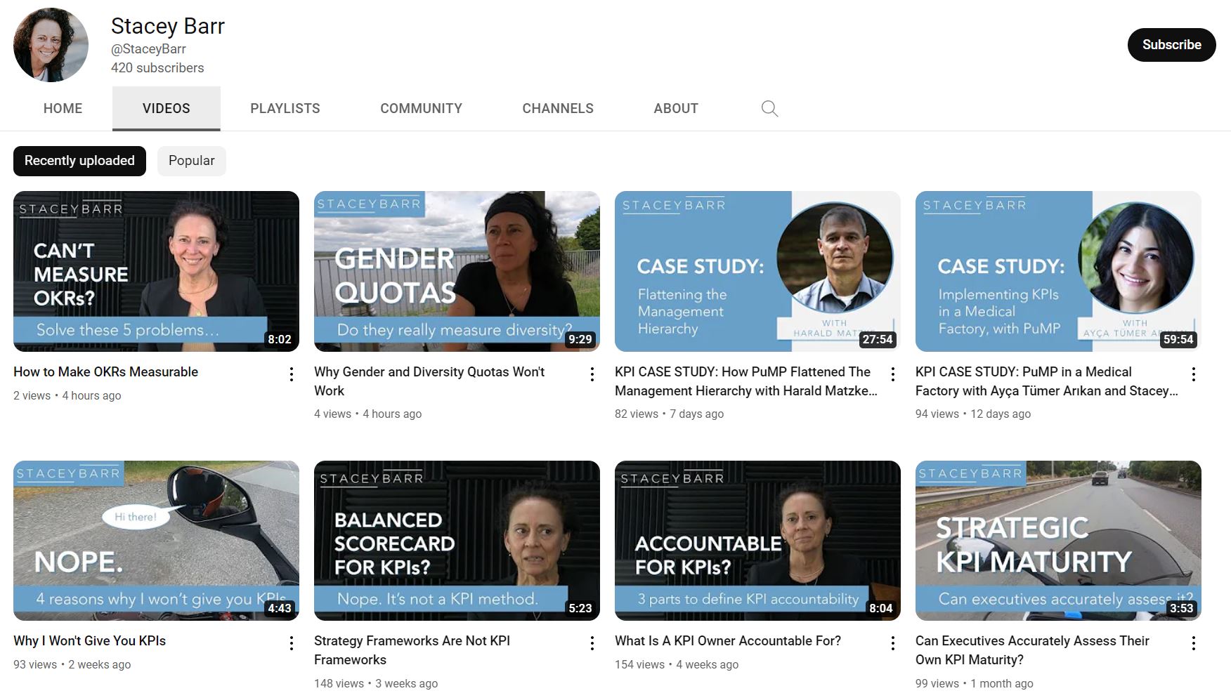 , if you'd prefer to watch and share videos of my content, please feel very welcomed to subscribe to my channel. Subscribe to my KPI YouTube channel...Stay up to date with the latest content I'm converting to video, and search for the topics you need, by subscribing to the channel here: Also, please always feel welcomed to email me with your preferences, and suggestions for topics you'd like to see, either in the Measure Up email or on the YouTube channel! P.S. The direct link to my YouTube channel is https://www.youtube.com/@staceybarr. |